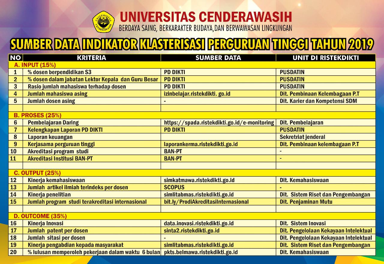 Kb.00.02/2019 tanggal 4 april 2019 tentang klasterisasi perguruan tinggi indonesia tahun 2019 (terlampir), bersama ini dengan hormat kami informasikan bahwa kementerian riset, teknologi, dan pendidikan tinggi akan kembali melaksanakan klasterisasi perguruan tinggi di indonesia. Informasi terbaru, pihak kemendikbud telah mengumumkan 15 ptn yang masuk pada kluster i. Sehubungan dengan hal tersebut, kami imbau perguruan tinggi agar dapat segera membarui dan melengkapi semua data dan informasi pada pd dikti dan pangkalan data terkait lainnya. This study aims to formulate a series of optimization strategies for improving ub's rank. Klaster 1 berjumlah 15 perguruan tinggi, klaster 2 berjumlah 34 perguruan tinggi, klaster 3 berjumlah 97 perguruan tinggi, klaster 4 berjumlah 400 perguruan tinggi, dan klaster 5.